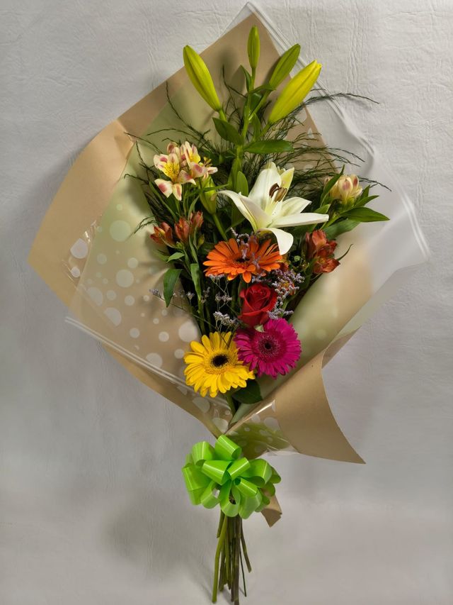 Este ramo abanico reúne flores distintas porque simboliza la diversidad de emociones que nos habitan. No habla de un solo sentimiento, sino de la vida en movimiento.