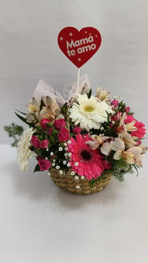 Canasta de flores variadas para Mama en su dia ( gerberas , alstroemerias y mini rosas con un pink mama te amo)