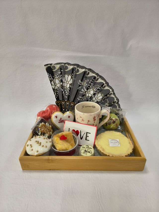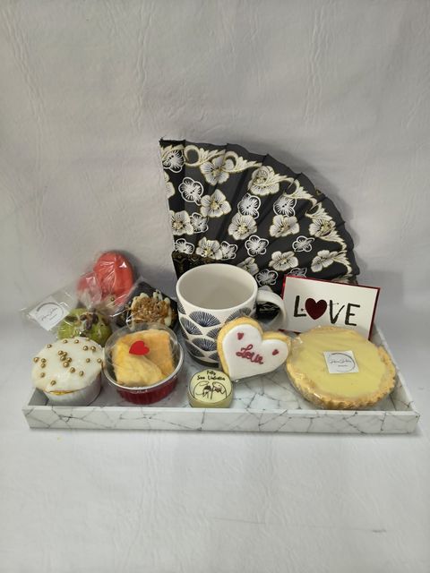 Incluye una selección de dulces artesanales ( 2 galletitas corazón, 1 brownie, 2 scons de queso, 1 cupcake de limón, 1 alfajorcito con mensaje, 1 tortita bon o bon, 1 cookie), taza temática y detalles románticos.